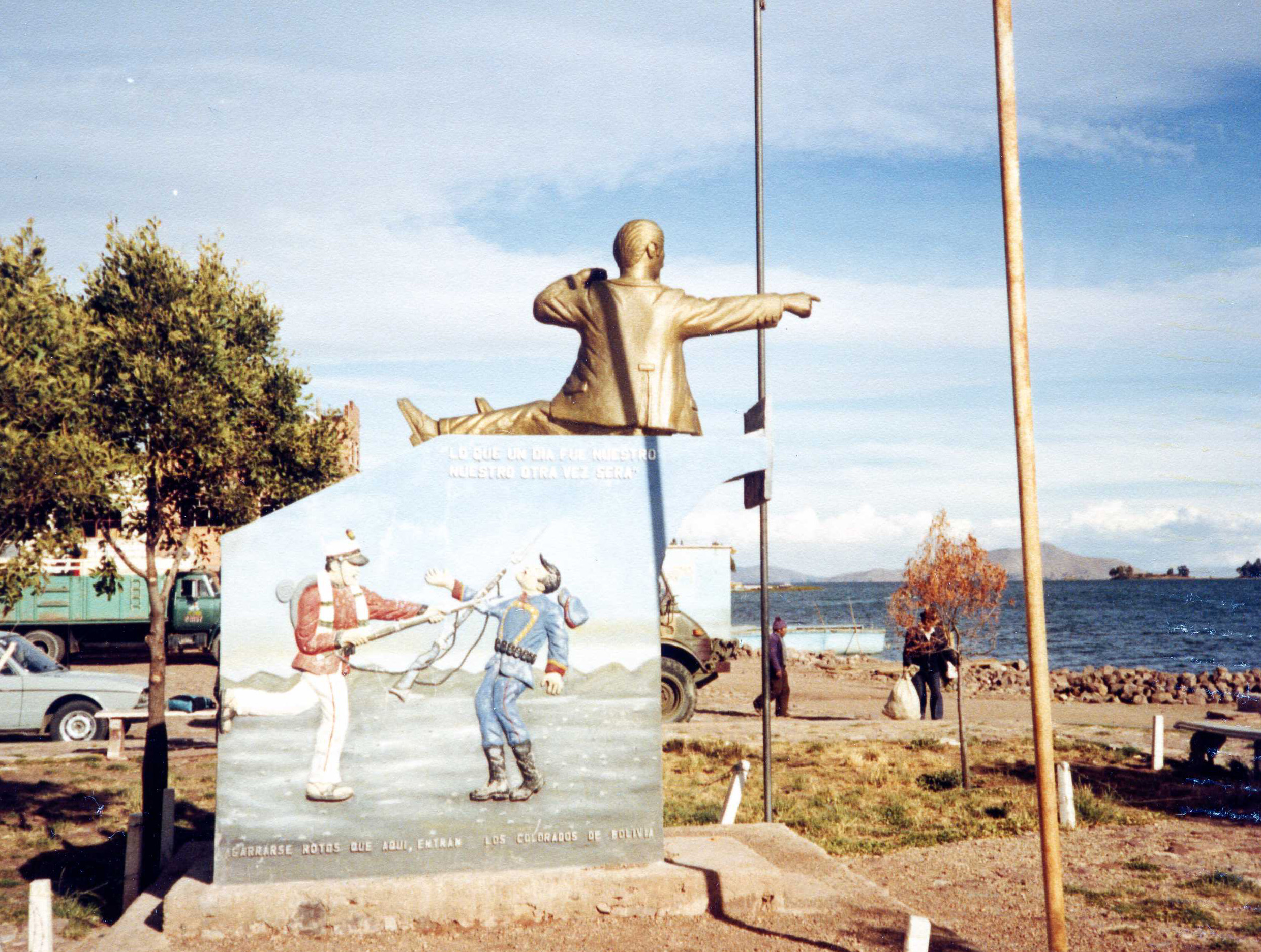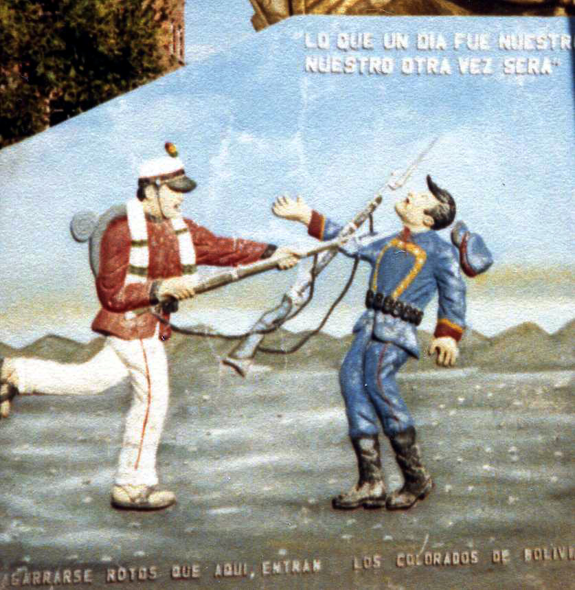 四 季 雑 感 (12) 樫村 慶一 チリの鉱山崩落事故にまつわる裏話し (その2) +++さて本題の太平洋戦争とは+++ 1860年代にスエーデン人のノーベルがダイナマイトを発明し世界的に硝石の需要が高まった。当時、ボリビアとペルーの領土だった南米の太平洋岸地域一帯からは大量の硝石が産出されており、ボリビア経済の根幹を支える貴重な資源になっていた。チリ人が英国と共謀してこの利益に目をつけたのである。すでに1870年代の終わり頃には、この地方には鉱物資源の採掘権をボリビア政府から譲渡されたチリ人や英国人が多数進出していた。ボリビアの太平洋岸と本国の中枢とは、真ん中に6000米を越えるアンデス山脈が聳えていて十分な行き来ができず、通信手段も人馬が頼りであったため、首都ラ・パスと海岸地方の間の情報伝達はきわめて不自由であった。そのため政府の監督の目が十分に届かなかった。採掘権だけでは飽き足りぬチリはこれにつけこみ、英国と組んでこの地方を武力によって自国領土にしようとの野望を抱いた。その手段として、ボリビア政府と協定した税金を意図的に滞納したりして、ボリビア政府を挑発したのである。不安を感じたボリビアとペルー両国は、チリに対抗する同盟条約 を結んだ。1879年の初めに、ラ・パスから海岸地方の地質調査に来た鉱山技術者が、チリ人の横暴な進出を見て大統領に報告、政府は初めて事態の緊迫に驚いた。鉱山技師からの報告書が届けられた時、大統領官邸ではパーティーが行なわれており、緊急報告書は翌日まで開かれないままになっていた。それほど、政府は海岸地方の状況に緊張感がなかったのである。しかし、ここから事態は一挙に戦争へと転がり落ちる。 1879年2月、チリがアントファガスタを占領する。挑発に耐え切れなくなったペルーがまづ宣戦を布告し、ここに太平洋戦争が勃発した。十分に準備をしていたチリ軍は、ペルー、ボリビア連合軍を緒戦で簡単に撃破した。しかし、連合軍側も反撃し戦況は一進一退のまま推移した。 一方、チリの有力な政商達は、言葉巧みに、ボリビア政財界や軍隊上層部などに食い入り、ボリビア政府の政策などの秘密情報を入手し、逐一チリ政府に通報するなどのスパイ行為を働いていた。こうして政商達から絶えず最新情報を得て、常に軍備を整えていたチリ軍は、海岸地方の都市を次々に占領していった。そして、援軍として遥々とアンデスを越えてきたボリビア軍と大規模な会戦を行った。ボリビア軍とペルー軍は緊密に連携して戦ったが、1880年5月の戦いで遂に連合軍は大敗を喫してしまった。 勢いに乗るチリ軍は1881年1月、ペルー中央部まで進出し首都リマを占領した。このとき、インカ帝国が支配していたペルーを侵略したスペイン人ピサロのミイラが安置されている大聖堂もチリ軍に蹂躙された。惨敗を喫した両国は、まず1883年にペルーが降伏し、1884年にはボリビアがアルゼンチンに仲裁を頼み、休戦協定を結んだ。こうして戦いは漸く終わった。 (上の写真は、ボリビア兵(左の赤服)がチリ兵をやつけている場面、下の写真を拡大したもの)) +++++ これがのちにボリビアを”南米で最貧国”と言わしめるもとになった、海への出口を失う原因となった太平洋戦争の概略である。天然資源と貿易 港という国を支える2本柱を失ったボリビアは今もって、「黄金の椅子に眠る乞食」 と皮肉られ南米の最貧国に甘んじている所以でもある。ボリビアやパラグアイの貧困な経済のため南米大陸を一つの域内とする関税自由化交渉がまとまらず、ボリビアは現在でも他の国の発展の足を引っ張っている。これだけ見ても、当時の政府の不手際が如何に大きな失政だったかが分かるというものである。チリとボリビアはその後何回か国交断絶と再開が繰り返されてきたが、いずれも根本的な解決を見出せずにきている。1987年4月にはウルグアイのモンテビデオで、海への出口の返還交渉が行われたが、当時のチリのピノチェット大統領は、一片の土地も譲らないと強行姿勢を示した。これに対してボリビア外相が、卑怯者とののしったり、チリ製品のボイコットを決めるなど、両国関係は一触即発の危機状態に陥ったこともあり、今もって不仲は解消されていない。今回の落盤事故のような場合を利用してでも、なんとか交渉の糸口が欲しいボリビアは気の毒と言うほかない。 ボリビアの太平洋への出口への欲求は、日本の北方領土返還の悲願と同じようなものであるが、こちらの方は、国の繁栄が止まって以来、すでに120年以上も訴えつづけているのだ。チリが返還に応じる可能性は殆ど無いだろうから、ボリビアにとっては未来永劫に背負わなければならない宿命であると言える その1で述べた兎の形をしたチチカカ湖(小チチカカと言われる)から、本来のチチカカ湖に渡る渡し 舟の桟橋の横に、コンクリートでできた記念碑が建っている。ボリビアにとって、悔やんでも悔やみきれない、太平洋戦争のモニュメントで